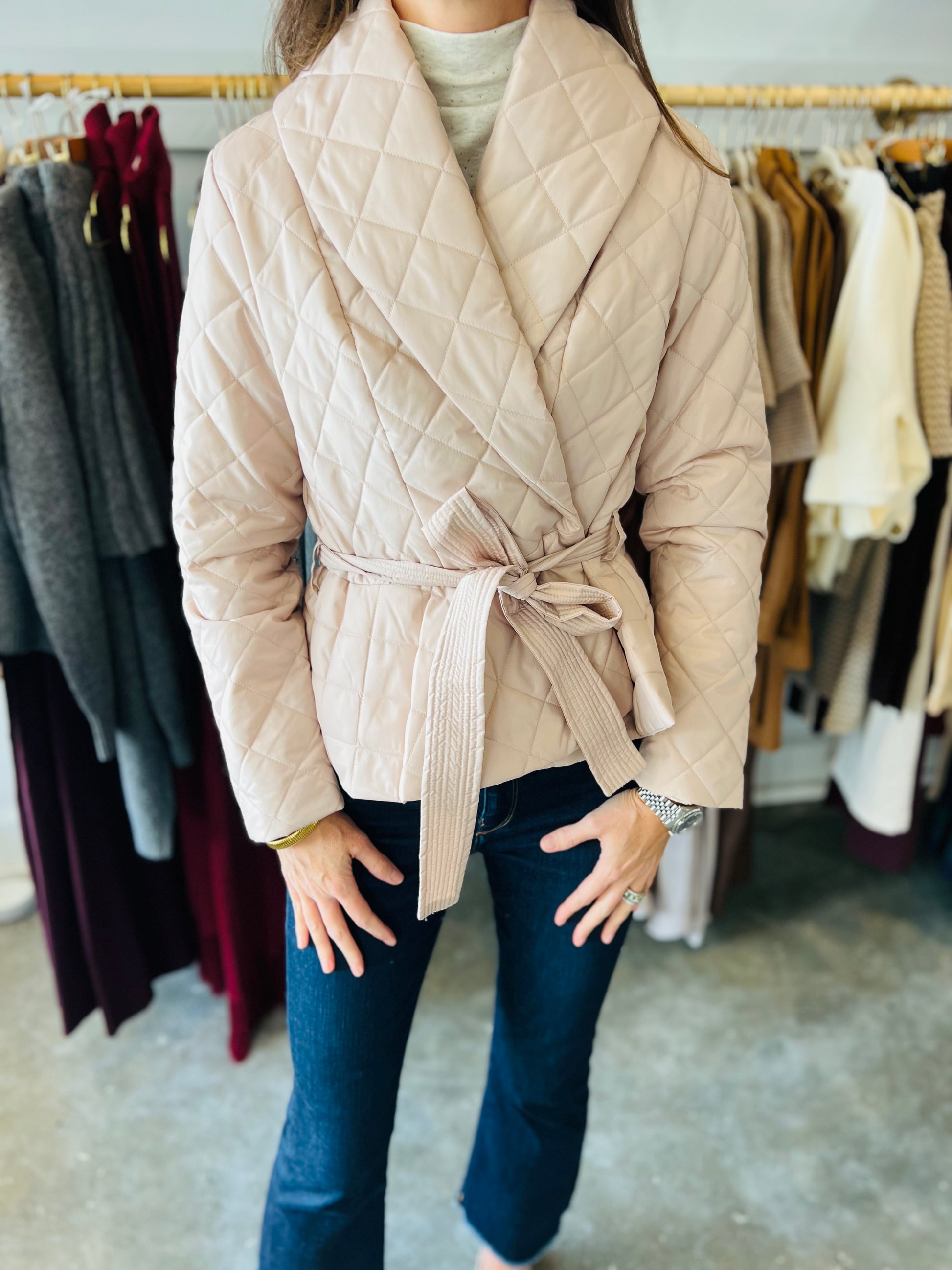 A ladylike quilted jacket never goes out of style, and the Lark effortlessly exudes sophistication while exhibiting form and function. A shawl collar wrap front is paired with a trapunto stitch tie belt and cropped hem for a modern reinvention of a classic wrap coat. Versatile and glamorous, we love layering it over the Barrett dress for long days that turn into longer evenings.