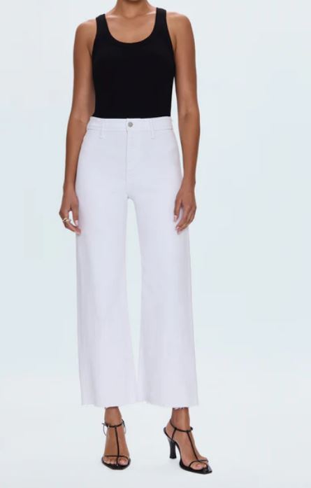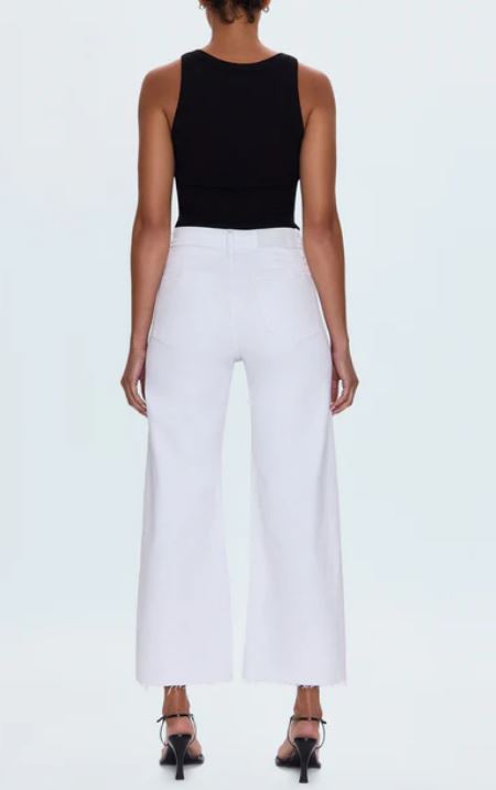 The white jean that changes everything. Penny Crop commands attention with a high-rise waist and wide leg silhouette that flows to a perfectly cropped ankle length, finished with a 27" inseam. Designed with no front pockets and no outer seams for a seamless, clean silhouette. The double-stitched waistline adds structural detail while the scissor-cut hems bring raw edge appeal. Crafted from our signature comfort stretch denim in Blizzard, a crisp white wash.